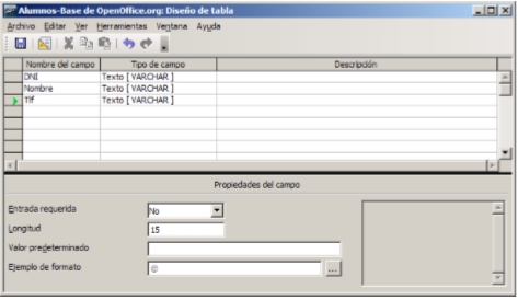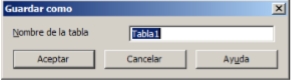 Es decir, tanto el DNI como el Nombre como el Tlf son campos de texto, y como longitudes respectivas hemos utilizado: 15, 40, 15. Cuando terminemos, pulsamos el botón de “Guardar” (el que muestra un diskette) y nos preguntará el nombre que queremos dar a la tabla (en nuestro caso, “Alumnos”):