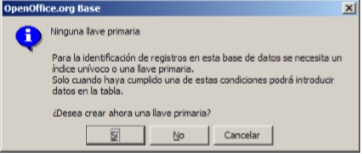 Es cierto, habíamos pensado que el DNI debía ser la clave primaria de nuestra tabla, pero no se lo hemos indicado a Base. Pero no queremos que sea Base quien ponga la clave primaria que le plazca, sino nosotros mismos, así que de momento le decimos que “No” queremos clave primaria, y veremos cómo indicarle que ponga como clave el campo que a nosotros nos interesa.