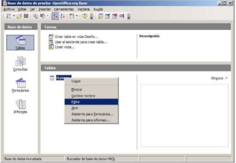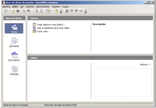 Entonces apareceremos en la pantalla principal de OpenOffice.org Base, que nos permite crear y manejar varios tipos de elementos. El primero de ellos (y el único que nos interesa por ahora) son las Tablas. En concreto, nos propone varias “tareas” relacionadas con las tablas: crear en vistar de diseño, usar un asistente o crear una vista: