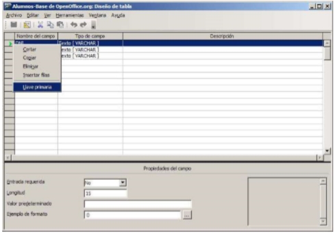 La forma correcta de indicar que un campo será la clave primaria es señalando toda la fila (haciendo clic con el ratón en la columna gris de la izquierda) y pulsando el botón derecho del ratón. Entre las opciones disponibles, aparecerá la de “Llave primaria”: