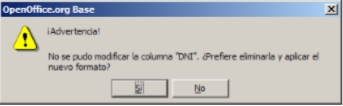 Puede ocurrir que, en alguna circunstancia, Base considere que esa modificación no se puede realizar directamente, conservando los datos actuales, sino que habría que eliminar el campo que hemos modificado, para luego volverlo a crear. En ese caso, podríamos llegar a perder los datos existentes en ese campo, si ya hubieramos introducido alguno. Cuanto más avanzado sea el gestor de base de datos, menos habitual es que podamos tener algún problema de este tipo, pero, en cualquier caso, eso nos muestra la importancia de tener afinado el diseño antes de empezar a introducir datos: