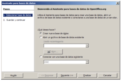 El primero que utilizaremos es OpenOffice.org Base, la base de datos que incorpora la suite OpenOffice, por tratarse de un paquete integrado de libre distribución (“gratis”), que se puede encontrar tanto para Windows como para Linux (yo lo usaré desde Windows). Como ya veremos, su manejo recuerda mucho al de Access. Nada más entrar a OpenOffice.org Base nos aparece un asistente que nos pregunta si queremos crear una nueva base de datos, abrir una existente (creada con Base) o “conectar” con otra que ya exista pero se haya creado con otro gestor de bases de datos: