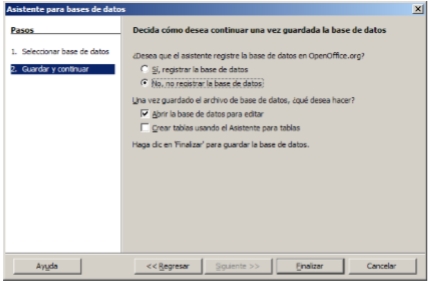 Escogemos la opción de “Crear una nueva base de datos”, y entonces se nos pregunta si queremos “registrarla” para que aparezca en la lista de bases de datos existentes (yo le diré que “No” quiero que lo haga, porque prefiero abrirla haciendo doble clic desde su carpeta contenedora) y si queremos abrir la base de datos para editarla (yo le diré que sí, para empezar a experimentar):