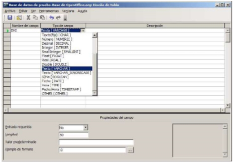 En nuestro caso, como ya hemos preparado el diseño “sobre el papel”, prescindiremos del asistente y usaremos la “vista Diseño”. Accedemos a una nueva ventana, en la que realmente definimos nuestra tabla con Base. La zona de trabajo de esta ventana tiene tres columnas, en las que indicaremos el nombre del campo, el tipo de datos que va a almacenar y (si queremos) una descripción para ese campo:
