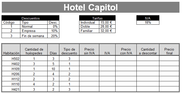 - La cantidad a descontar es el porcentaje correspondiente del precio sin IVA aplicando la tabla de descuentos. Para aplicar esta tabla tendrás que utilizar la función BUSCARV.