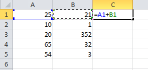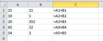 Tenemos unos números en la columna A que queremos sumar a los números de la columna B. Se trata de sumar el número de la celda A1 y el número de B1 y el resultado ponerlo en C1. Sumar el número de la celda A2 y la celda B2 y el resultado ponerlo en la C2. Y así con todas las filas de números.