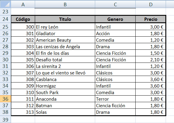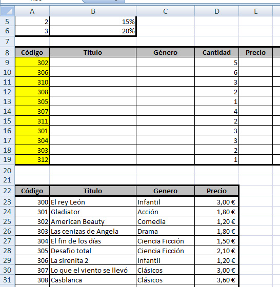 En la tabla principal par conocer el título, genero y precio de la película podemos usar la función BUSCARV. Se tratará de buscar el código en la tabla inferior y que nos devuelva el valor deseado.