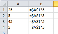 Por ejemplo, si escribimos la operación = A1*5 en la celda B1 y copiamos la celda hacia abajo, las fórmulas que se obtienen se ajustan tal y como podemos ver en la siguiente imagen: