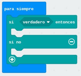 El bloque «si < > entonces… si no…» comprobará si la condición programada se cumple o no. Si se cumple, ejecutará el programa colocado en el primer hueco (justo después de «entonces»). Si no se cumple, omitirá el programa colocado el primer hueco y ejecutará el colocado en el segundo hueco (justo después del «si no»). En resumen, con este bloque podemos programar dos secuencias de bloques alternativas, y se ejecutará una u otra según se cumpla o no la condición indicada.