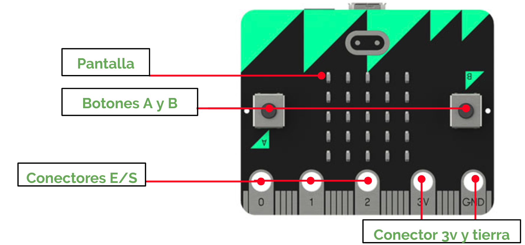 - Dos botones (etiquetados como “A” y “B”) que podremos utilizar para activar código en el dispositivo.