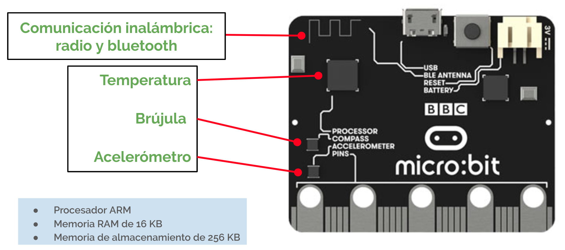 - Módulo de radio, para comunicarnos de forma inalámbrica con otras micro:bits.