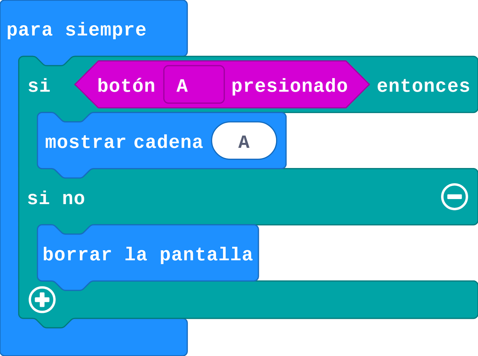 Para comenzar a aplicar condiciones, podemos programar la placa para que al pulsar el botón A, se muestre la letra A en la pantalla, y que la pantalla se apague si el botón no está pulsado.