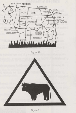 Otro tipo de imagen de una vaca es la que representa la figura 10; ya no es una vaca particular, no existe como ser vivo, es menos icónica que la anterior; es una abstracción. Está hecha para comunicar algo muy definido, nos informa sobre el despiece de las partes de las vacas, y es útil cuando vamos a la carnicería a comprar; si pedimos filetes de una pieza que lleve el rótulo de «aguja», con ayuda de la imagen sabremos que estamos pidiendo carne perteneciente a la espalda y no a la pata del animal. La imagen ya no es el retrato de ninguna vaca, se refiere a la idea de vaca que tenemos todos en la mente y podría representar a cualquier ejemplar de la especie, independientemente