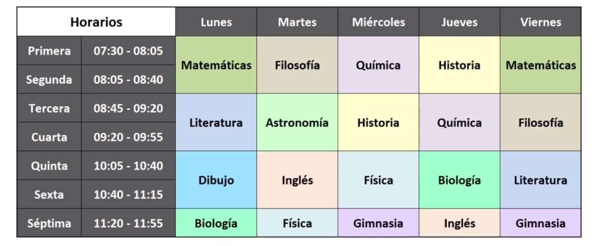 – El horario de clases es una abstracción de lo que ocurre en una semana en una escuela, liceo u otra institución educativa. Tiene información clave sobre qué materias hay y en qué horarios, pero no incluye por ejemplo los temas o las actividades de una clase en particular.