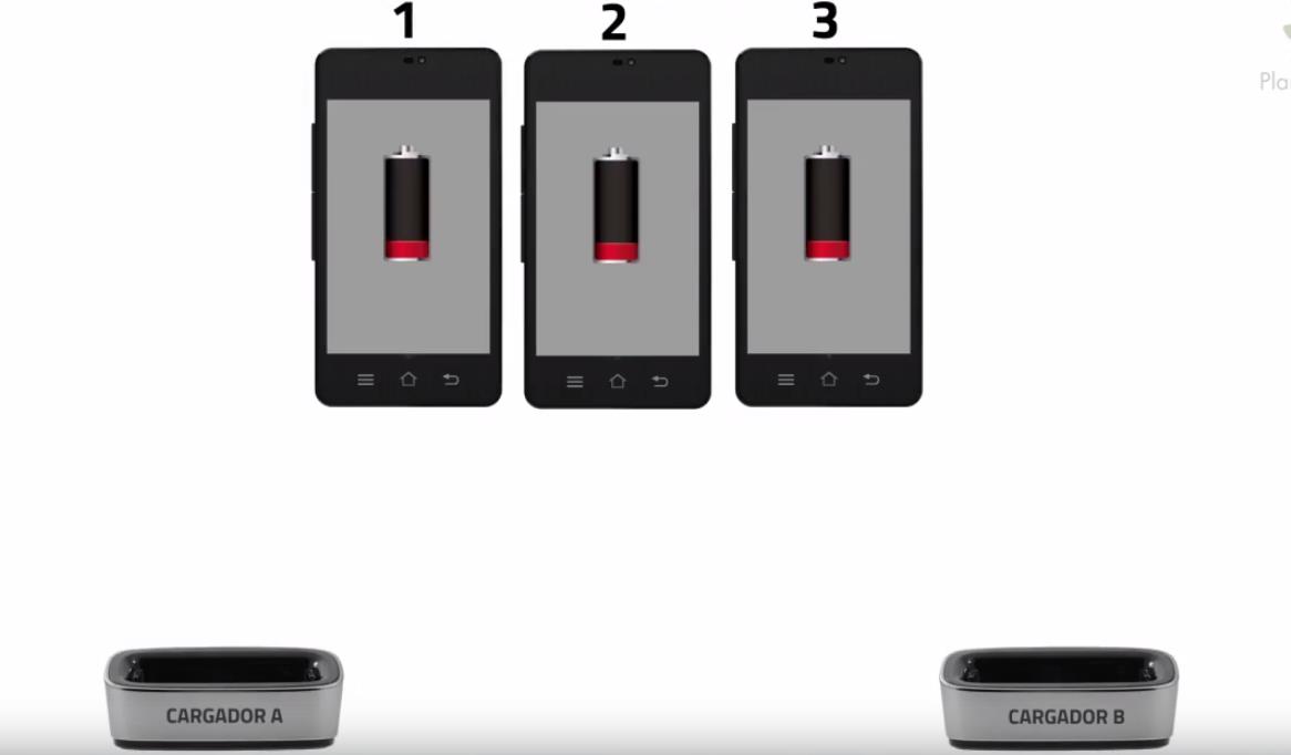 Una primera idea sería poner a cargar uno a continuación del otro. ¿Cuánto tiempo llevaría? Llevaría 3 horas usando uno sólo de los cargadores. Otra opción sería poner a cargar dos de ellos una hora (uno en cada cargador), luego ponemos en uno de los cargadores el tercer celular por otra hora. El tiempo total en este caso es de 2 horas.