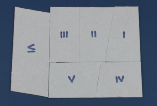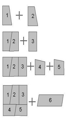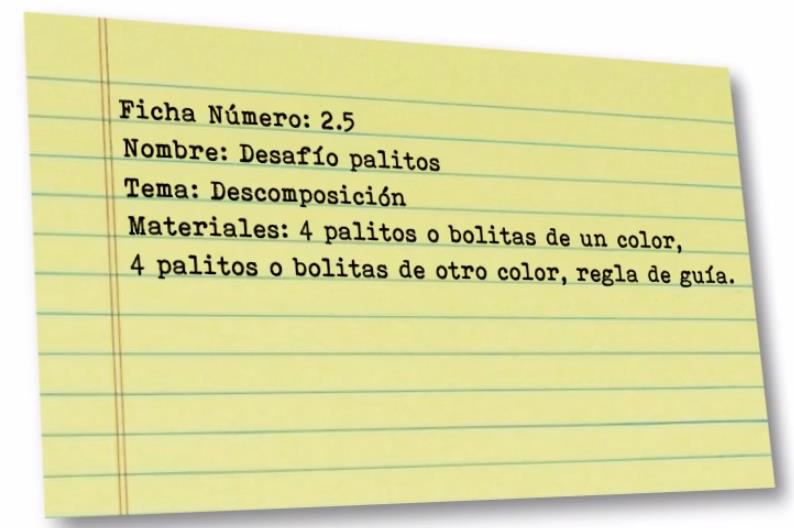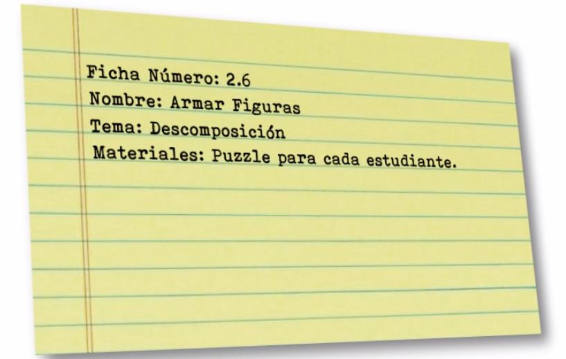 En esta actividad se solicita ir construyendo figuras geométricas reconocibles a partir de ciertas piezas o fichas. Se entrega a cada alumno un conjunto de fichas numeradas y se le indica que arme una figura geométrica reconocible utilizando únicamente la pieza 1 y la pieza 2. Luego que armó una primera figura, se señala que se incorpore la ficha 3, formando con esas 3 piezas una figura geométrica reconocible. A continuación, se indica que se forme una figura geométrica reconocible con las piezas 1, 2, 3, 4 y 5. El último paso es hacer una figura, también reconocible, que incorpore la sexta ficha. En la gran mayoría de los casos, la figura armada no permitirá agregar esta última ficha.