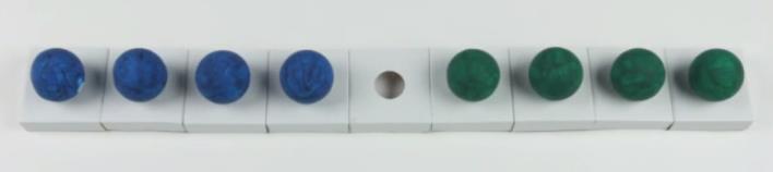 El juego tiene 4 palitos o bolitas de un color, 4 de otro color diferente y un bloque de madera con 9 agujeros alineados como guía. Inicialmente, los palitos del mismo color están puestos en los extremos, dejando el centro vacío. El objetivo es invertir los palitos, esto es, si estaban a la izquierda todos los azules y a la derecha los verdes, deben quedar a la derecha todos los azules y a la izquierda los verdes.