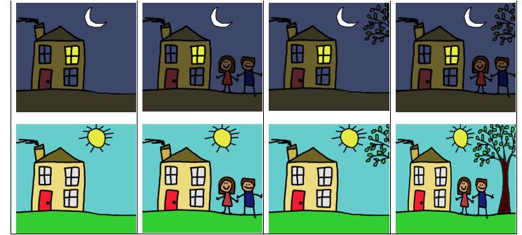 En esta actividad, se muestran las siguientes 8 imágenes, que incluyen una casa con y sin árbol, de día y de noche, con y sin personas: