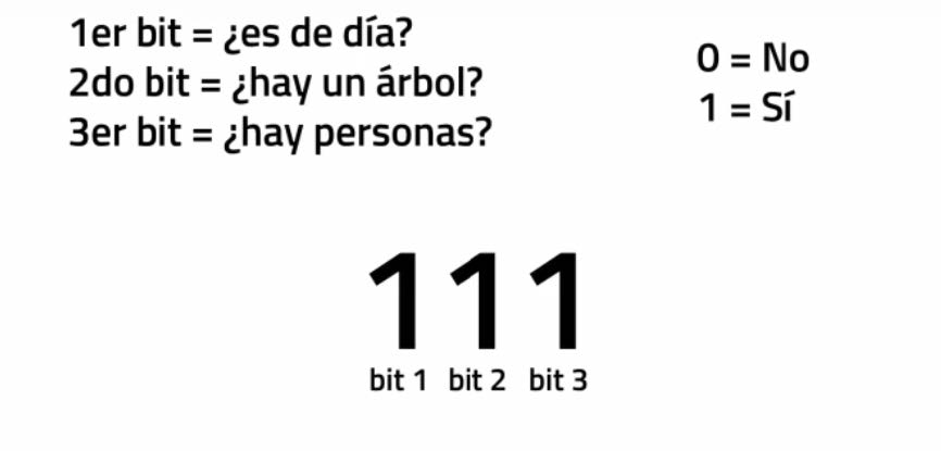 En Computación, un bit es un dígito binario y es la unidad mínima de información. Puede valer 0 ó 1. En este ejemplo, cada imagen tiene asociados 3 bits. Así, vinculamos el primer bit a «día», el segundo a «árbol» y el tercero a «personas». La respuesta «sí» se puede ver como 1 y la respuesta «no» se puede ver como 0.