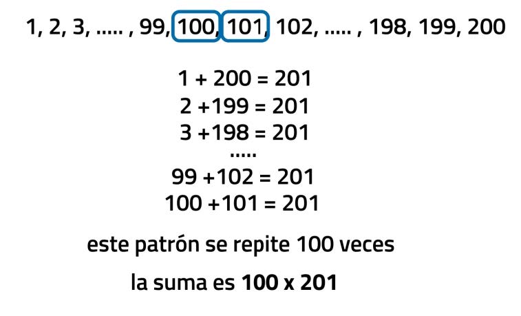 Repasemos un problema muy conocido. Supongamos que queremos sumar los números enteros del 1 al 200. Hacerlo a mano ciertamente es complicado, pero podemos detectar un patrón: el primero más el último, o sea, 1+200 es 201, el segundo más el penúltimo, 2+199 es 201, 3+198 es 201…, este patrón se repite 100 veces, así, la suma es 100*201. ¡Bien!