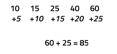 Otro caso de matemática: queremos determinar qué número continúa la serie: 10 15 25 40 60. Analizando, detectamos que la primera vez se sumó 5, la segunda se sumó 10, la tercera 15, la siguiente 20, … así que el próximo número de la serie será 60+25, o sea 85.