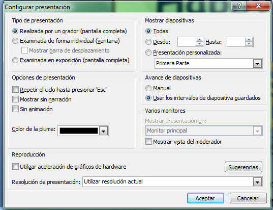 - Mostrar diapositivas. Podemos elegir qué diapositivas se van a a mostrar en la presentación.
