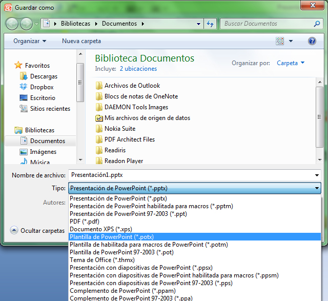 Nos aparecerá el cuadro de diálogo guardar como… Desde el cuadro combinado Tipo elegimos la opción Plantilla de PowerPoint.