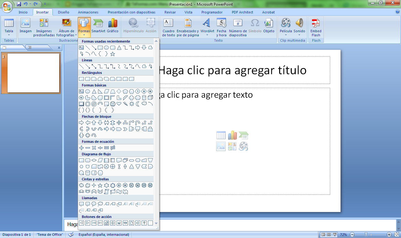 Para insertar una forma debemos seleccionarla de este listado y dibujar la con el ratón (pulsando y arrastrando con el botón izquierdo pulsado).