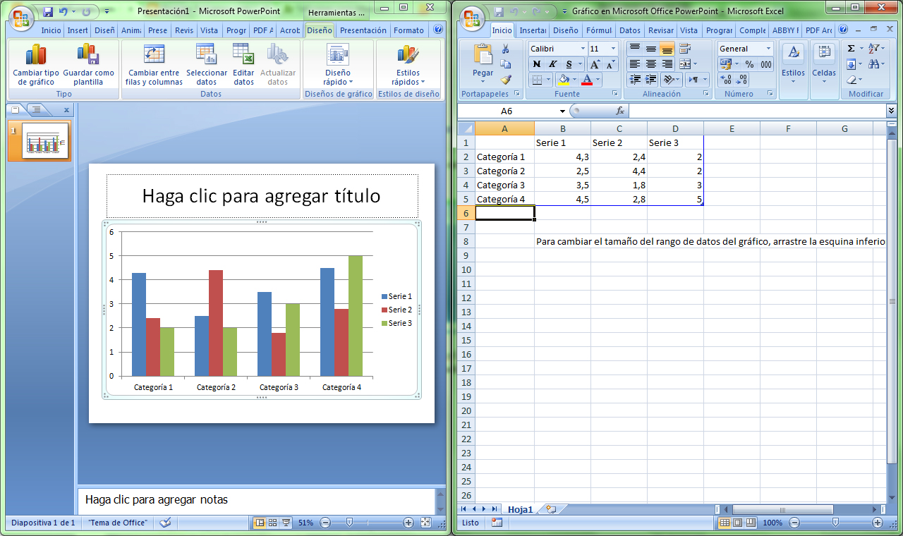 Cuando elegimos el tipo de gráfico deseado nos aparece una ventana de Excel asociada al gráfico. En esta hoja de cálculo aparecen unos valores por defecto. Debemos modificarlos añadiendo los valores que deseamos representar. Si queremos cambiar el tamaño del rango de datos del gráfico, arrastraremos la esquina inferior derecha del rango.