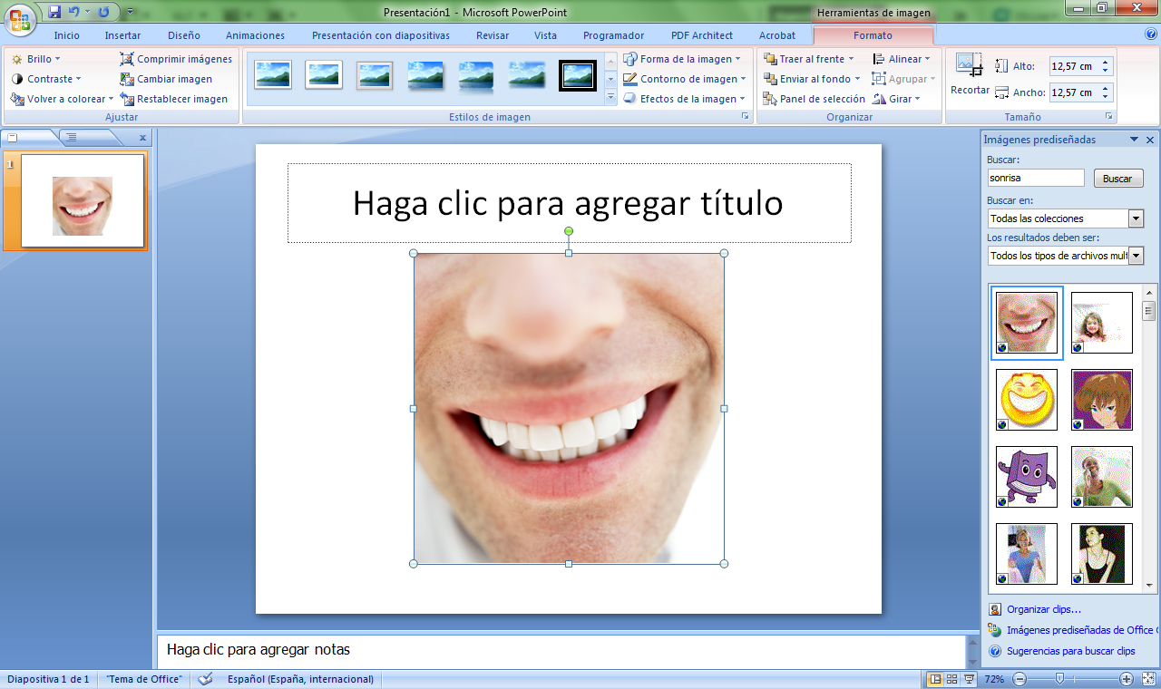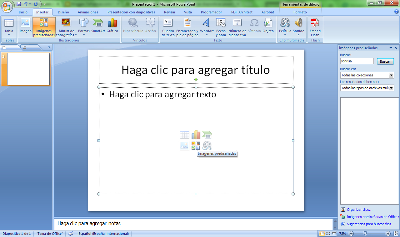 Desde este panel podremos insertar dibujos, fotografías, sonidos o películas a nuestras presentaciones. Simplemente debemos escribir en el cuadro de texto Buscar el término que define el objeto que queremos insertar (en el ejemplo se ha escrito Sonrisa) y pulsar el botón buscar o la tecla INTRO.