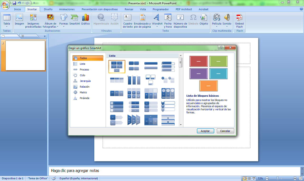 Para elegir el gráfico SmartArt, fijémonos en el tipo y el diseño más adecuados para mostrar nuestros datos. Podemos probar con los diferentes tipos de diseños hasta encontrar el que mejor ilustre el mensaje.