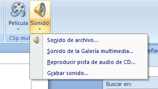 Al igual que ocurre con las películas podemos insertar un sonido de archivo o un sonido de la Galería multimedia. Por otra parte, PowerPoint también nos da la opción de reproducir una pista de un CD al mismo tiempo que se visualiza la presentación o grabar el sonido.