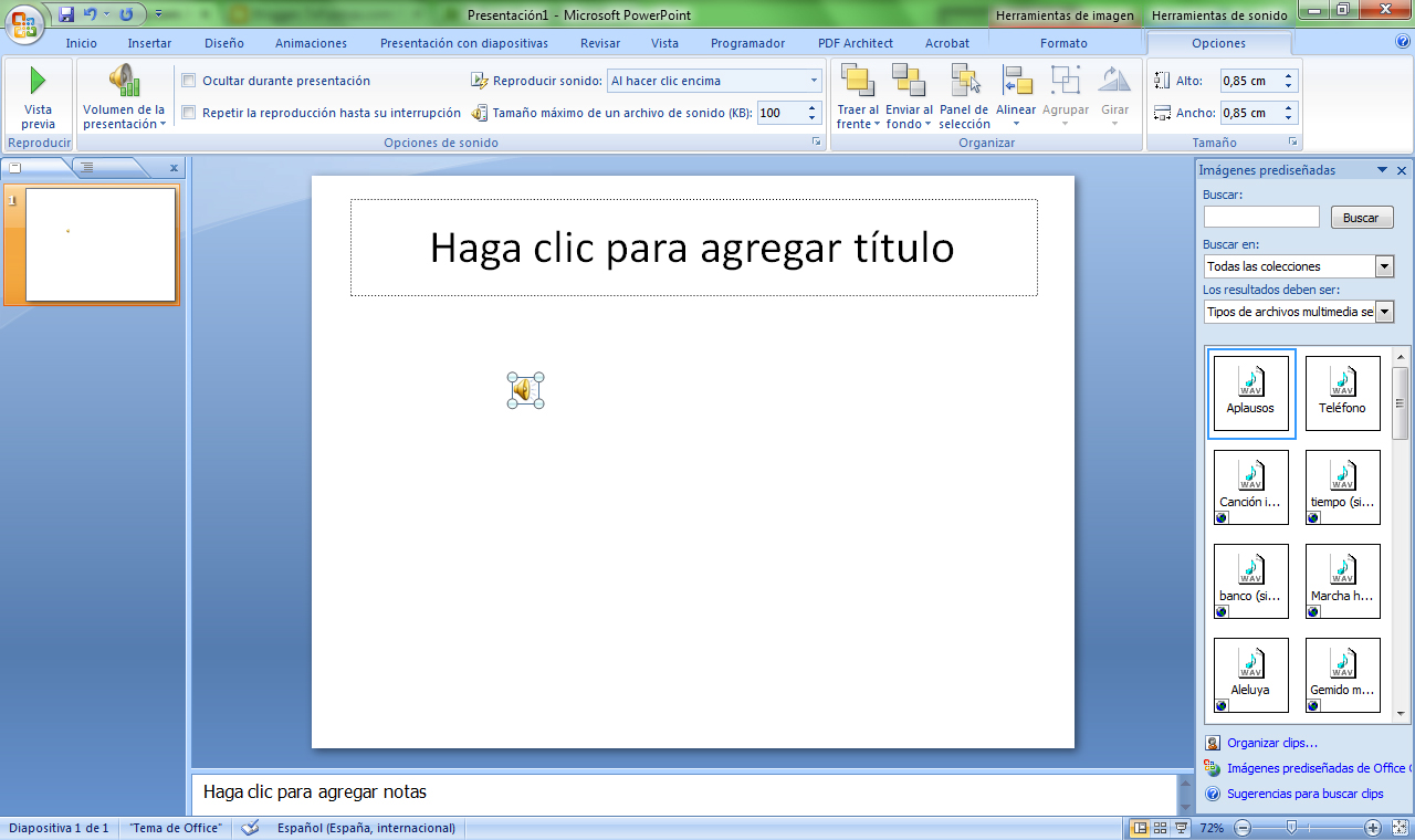 Cuando insertamos un sonido se muestra un pequeño icono en forma de altavoz en la diapositiva. Al mismo tiempo nos pregunta si deseamos que empiece su reproducción: Automáticamente o Al hacer clic.