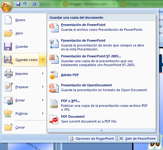 Opciones para guardar una presentación en PowerPoint 2007