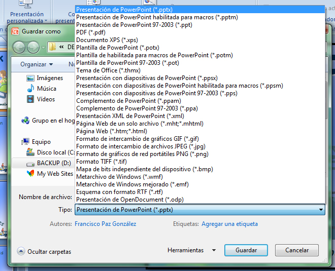 Desde el desplegable que aparece bajo el nombre tipo podemos guardar la presentación con otros formatos: